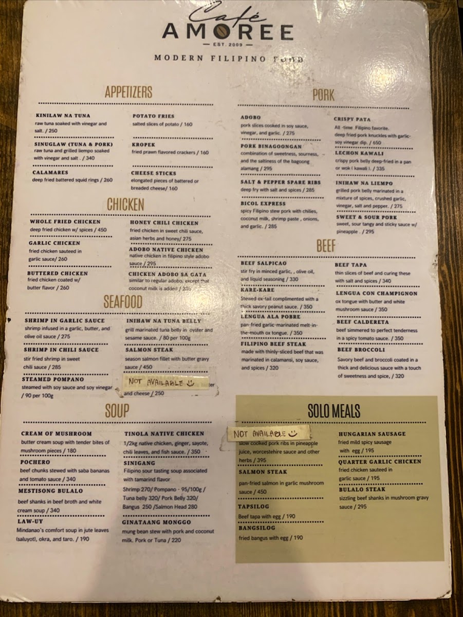 Food items are categorized into main dishes and light meals. Main dishes feature preparations such as Filipino Beef Steak, Beef Salpicao, KareKare (stewed oxtail with peanut sauce), and various chicken dishes like Garlic Chicken, Buttered Chicken, and Chicken Adobo Sa Gata (adobo with coconut milk). Italian influences are present with offerings such as Carbonara and Pesto Pizza. Additionally, traditional Filipino options such as Pancit Canton and Mestisong Bulalo are available.